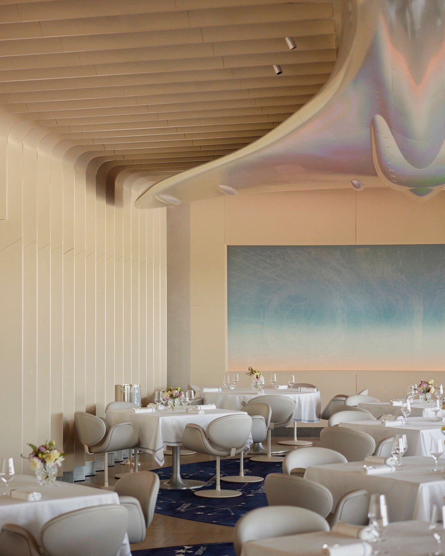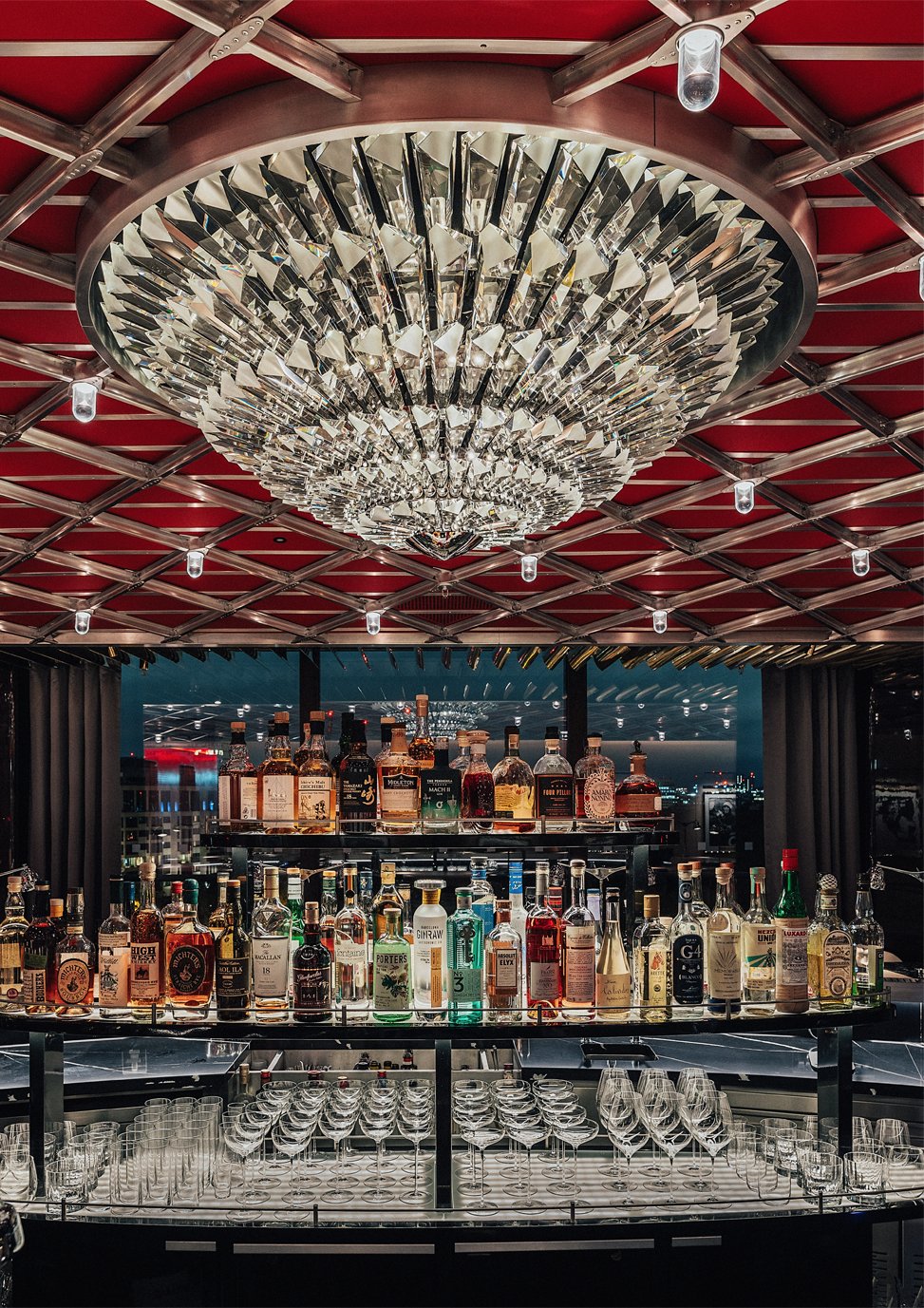 The bar’s design further embraces the restaurant’s themes of classic British aviation, motorsport, and fine craftsmanship. Its intricate latticed ceiling echoes that of a twin-engine bomber designed in the 1930s; its striking glass chandelier, meanwhile, replicates the blades of a Rolls-Royce turbine jet engine.